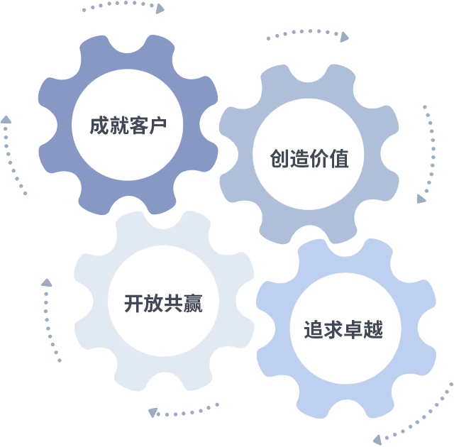 成就客户是一切决策的出发点,,,,创造价值是衡量所有工作的标准,,,,追求卓越是我们做事做人的态度,,开放共赢是我们的格局也是最终的结果。。。。价值观的齿轮环环相扣,,推动着组织里的每个人不断向前。。。