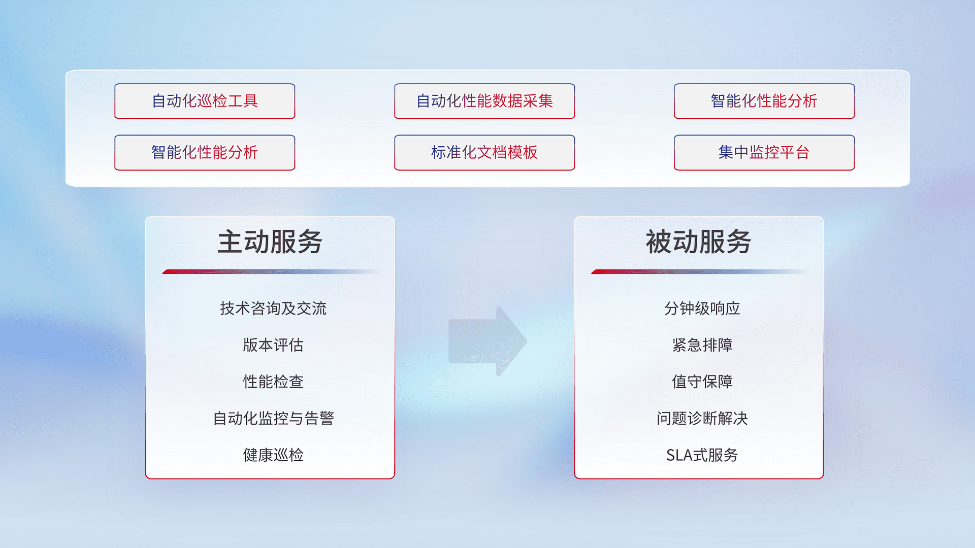 智能化工具和标准化文档,,,保障服务质量,,提供主动服务(包含技术咨询、、、版本评估、、、性能检查、、自动化监控与告警、、、健康巡检)和被动服务包含(分钟级响应、、、紧急排障、、值守保障、、、问题诊断解决、、SLA服务)。。。