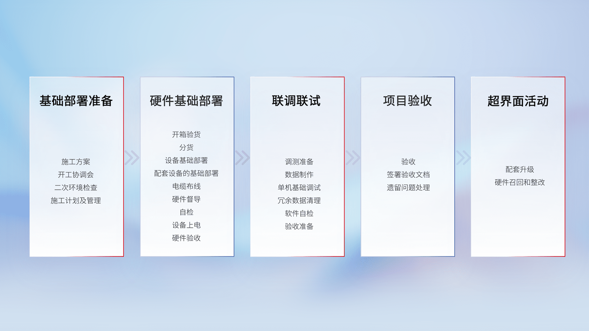 从基础部署准备、、、、硬件基础部署、、、、联调联试、、、项目验收、、、越界面活动的全过程可追溯,,保证施工质量和进度。。